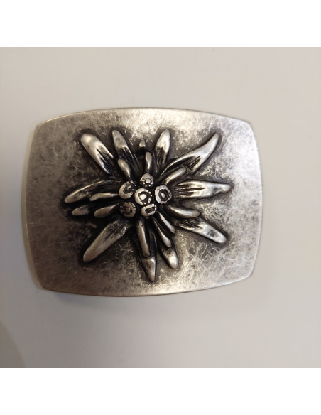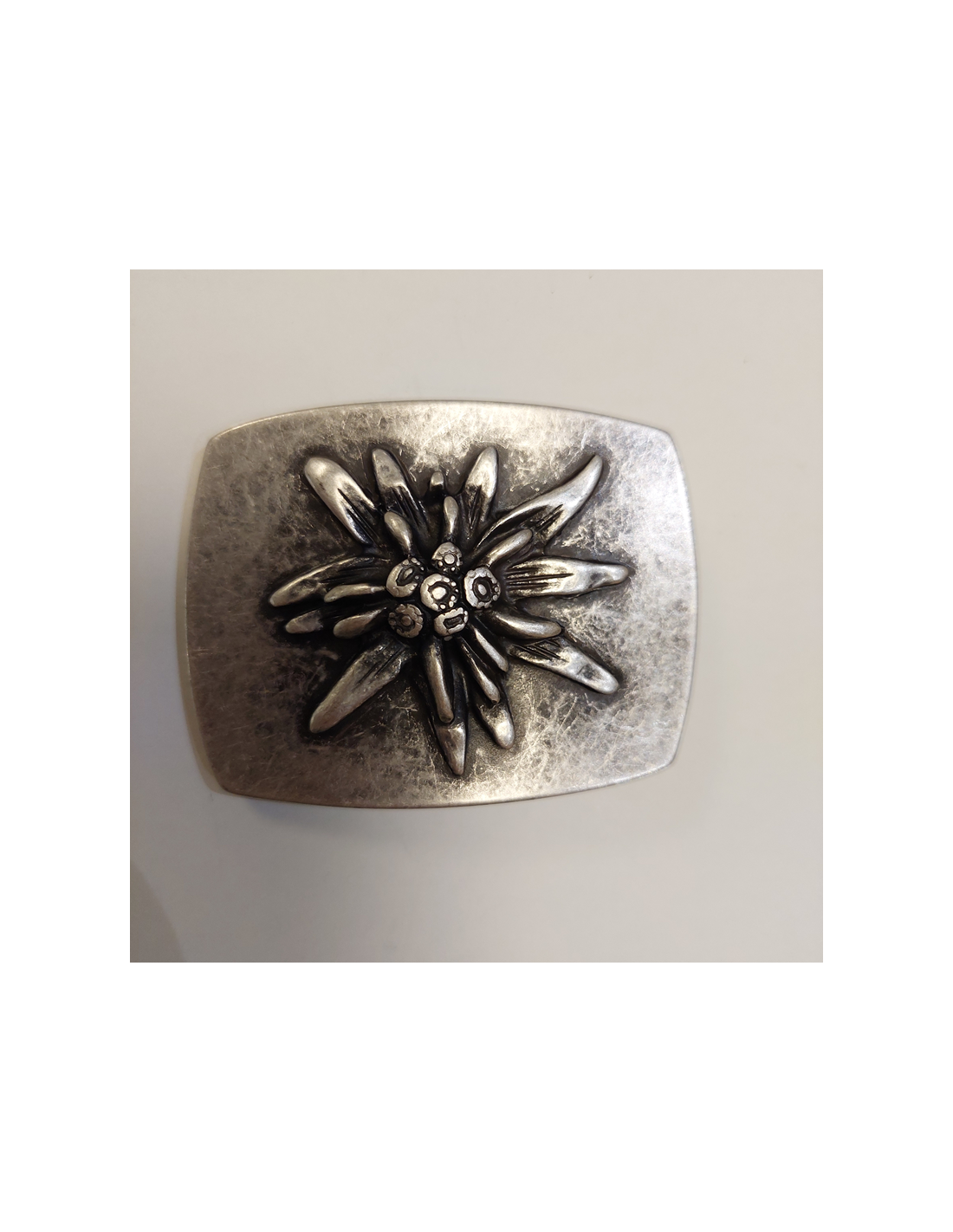 Hochwertige Schnalle mit filigranem Edelweiß-Motiv – traditionell, robust und ein echter Blickfang für Tracht und Freizeit.